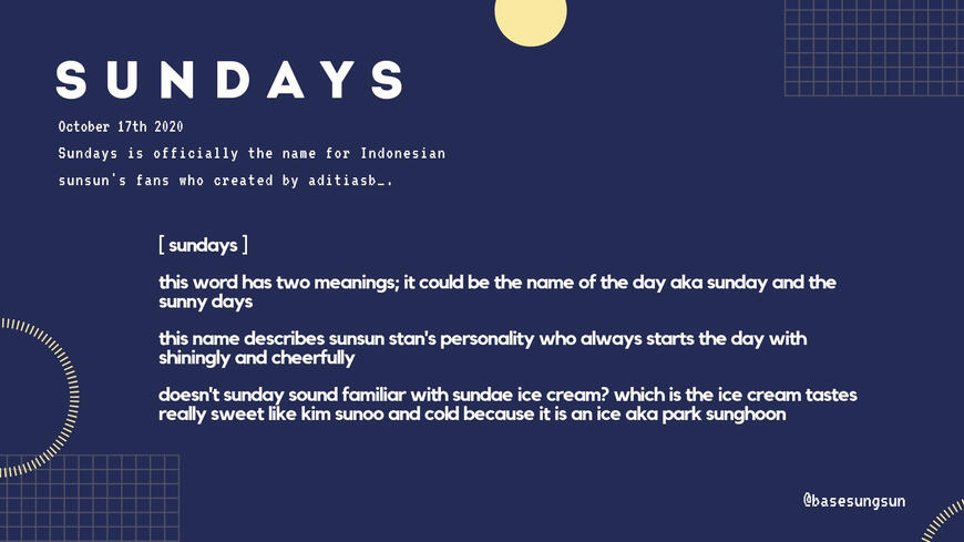 [ DISCLAIMER ]The name of 'sundays' was created for sunsun stans from Indonesia. However, if this name has been spread to international fans, and they are happy/want to call it, that's okay.